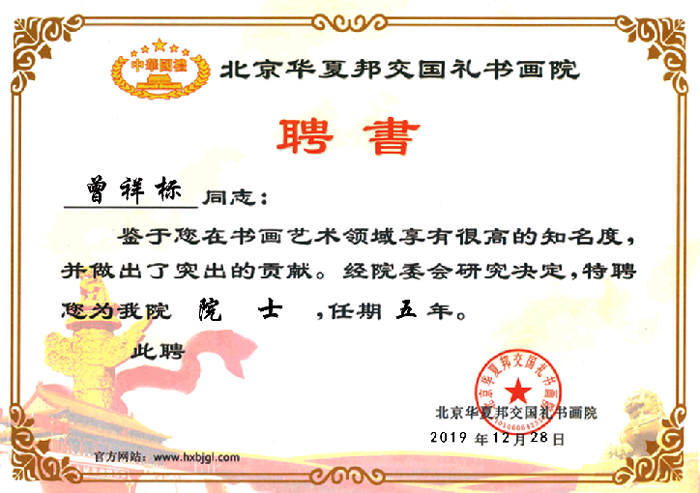 2019年12月被北京华夏邦交国礼书画院聘为该院院士;