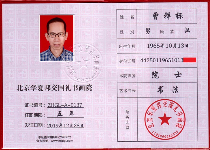 北京华夏邦交国礼书画院院士证编号:ZHGL—A—0137